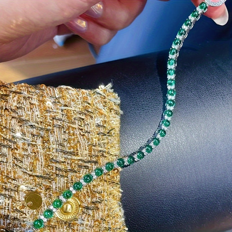 1pc Elegant 925 Sterling Silvery Bracelet with Fashion TO Ring Clasp, Non-Tarnish, Faux Gemstone Embellished, Suitable for Adults 15+, Green Faux Gemstone Accents